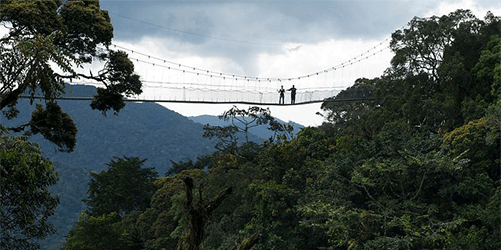 Suspended above a ravine in the lush montane rainforest of Nyungwe National Park, the canopy walkway provides an exhilarating perspective on the ancient treetops and wildlife.